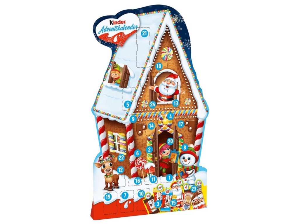 Adventní kalendář obsahuje 1x dětské karty, 3x Happy Hippo Cacao, 1x čokoládovou dutou figurku 15g, 7x kinder country mini, 4x kinder bueno mini a 8x kinder čokoláda mini. Malá čokoládová svačinka na každý den. První adventní kalendář KINDER MIX, který kombinuje vaflové a čokoládové výrobky.