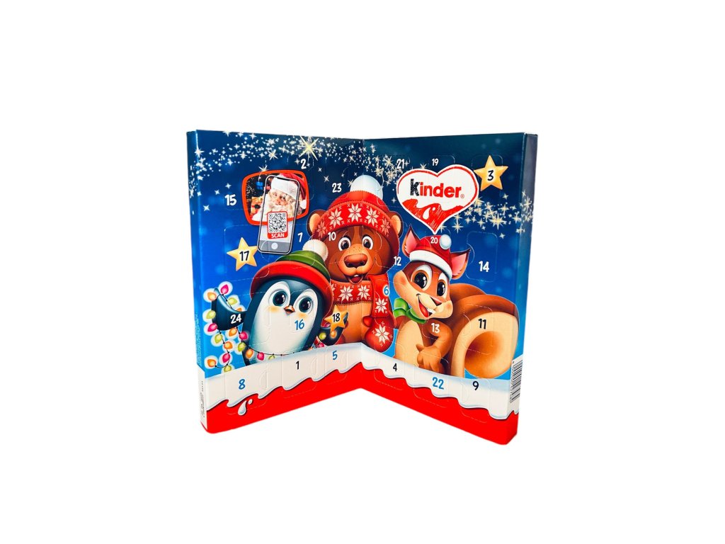 Adventní kalendář obsahuje: 11 x Kinder Mini Vejce oříškové, 11 x Kinder Mini Vejce Kinder čokoládové, 2x Kinder čokoládové plněné figurky. Inovativní „skládací funkce“ k nastavení. Stolní adventní kalendář s 24 jednotlivě balenými mini čokoládami.