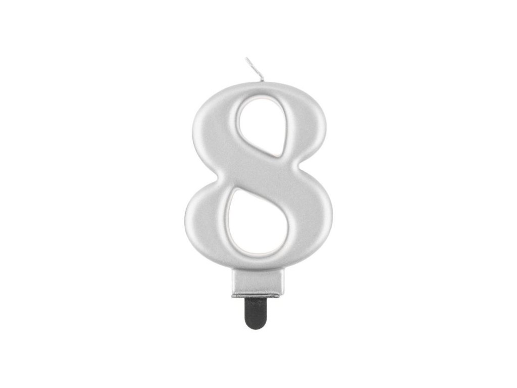 Elegantní stříbrná svíčka ve tvaru čísla 8, nesmí chybět na žádném narozeninovém dortu. Svíčka je opatřena plastovým podstavcem, který Vám umožní snadné umístění na dort. Výška svíčky je 8 cm.Podrobné informace o produktu získáte kliknutím .