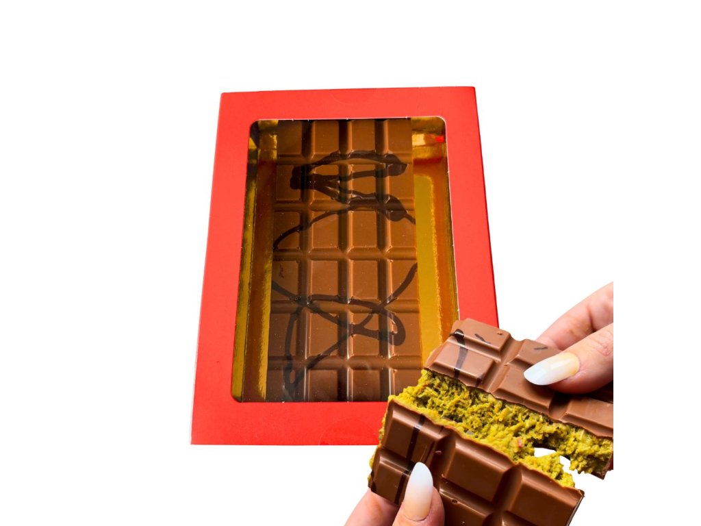 - Složení: cukr, kakaové máslo, 15% PISTACHA – OŘECHY, SUŠENÉ PLNOTUČNÉ MLÉKO, 10% kunafa ( (PŠENIČNÁ mouka, kukuřičný škrob, slunečnicový olej, voda, sůl, konzervant, (E202) ), slunečnicový olej, kakaová hmota, sušená syrovátka ( MLÉKO) , emulgátor ( (E322) ), (SOYA) ), přírodní vanilková příchuť , LOTOSE (MLÉKO) , SUŠENÉ ODTUČENÉ MLÉKO