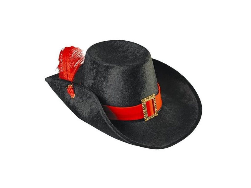 Černý klobouk mušketýra se zlatou přeskou, s červenou stuhou a pírkem. Délka: 40 cm Šířka: 31 cm Obvod hlavy: cm Výška: 12,5 cm Materiál: filcDoplňkové parametry