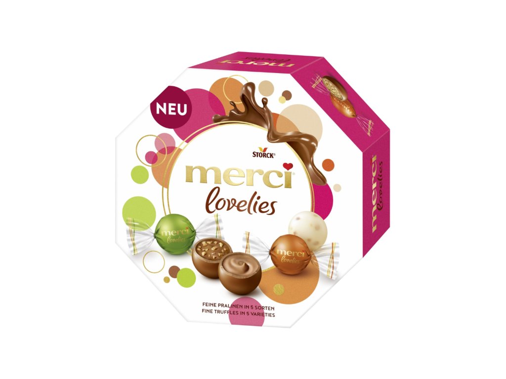 Sladké potěšení v dokonalé podobě. Lahodné Merci Lovelies Classic jsou vítaným dárkem pro všechny milovníky čokolády. Krásné dárkové balení obsahuje ty nejjemnější čokoládové kuličky v 5 neodolatelných variantách. S bílou čokoládou, plnotučným mlékem a hořkou čokoládou nabízejí velkou rozmanitost. Dárková krabička se 14 jednotlivě balenými čokoládami v 5 příchutích. Dárková krabička má rozměry cca 15 x 15 x 5cm a obsahuje tyto druhy: mléčná pralinka, bílá mandle, lískový oříšek a mandle, nugátové křupání a hořká pralinka.