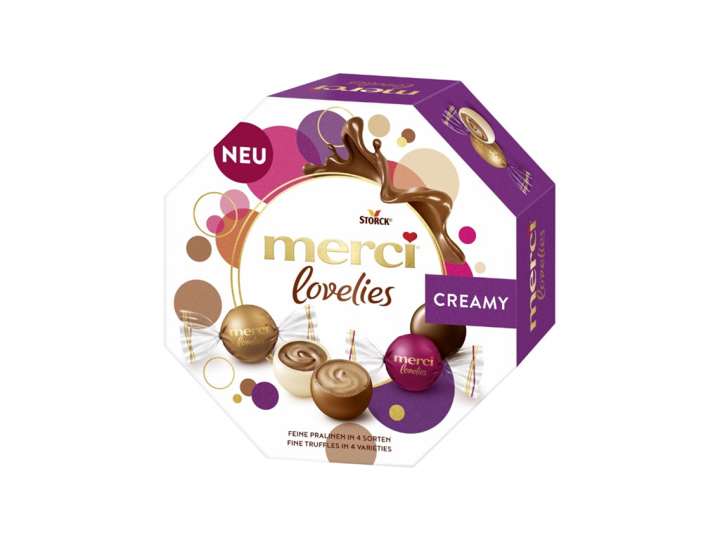 Kulatý požitek s krémovým jádrem. Lahodné Merci Lovelies Creamy svádějí nejen svou jemnou náplní, ale také plnou chutí. Křupavá skořápka ze tří různých druhů čokolády obklopuje jemné jádro se sladkou krémovou náplní, která se lahodně rozpouští v ústech. Skutečné potěšení z krásných okamžiků v životě. Dárková krabička se 14 jednotlivě balenými čokoládami ve 4 příchutích. Balení měří cca 15 x 15 x 5cm a obsahuje tyto druhy: mléčná pralinka, nugát, hořká pralinka, cappuccino krém.