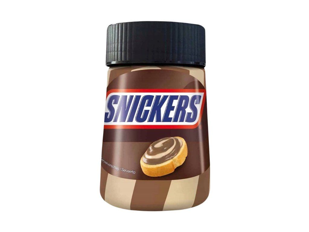 Krémová pomazánka s příchutí tyčinky Snickers, což zahrnuje kombinaci čokolády, karamelu a arašídů.