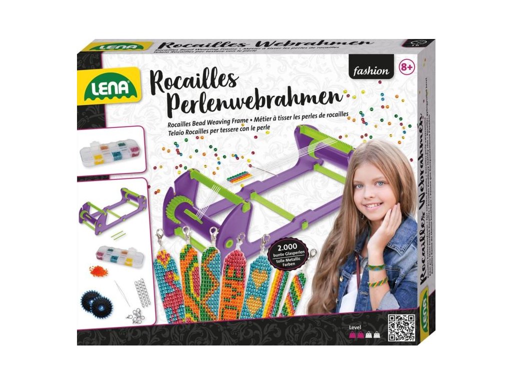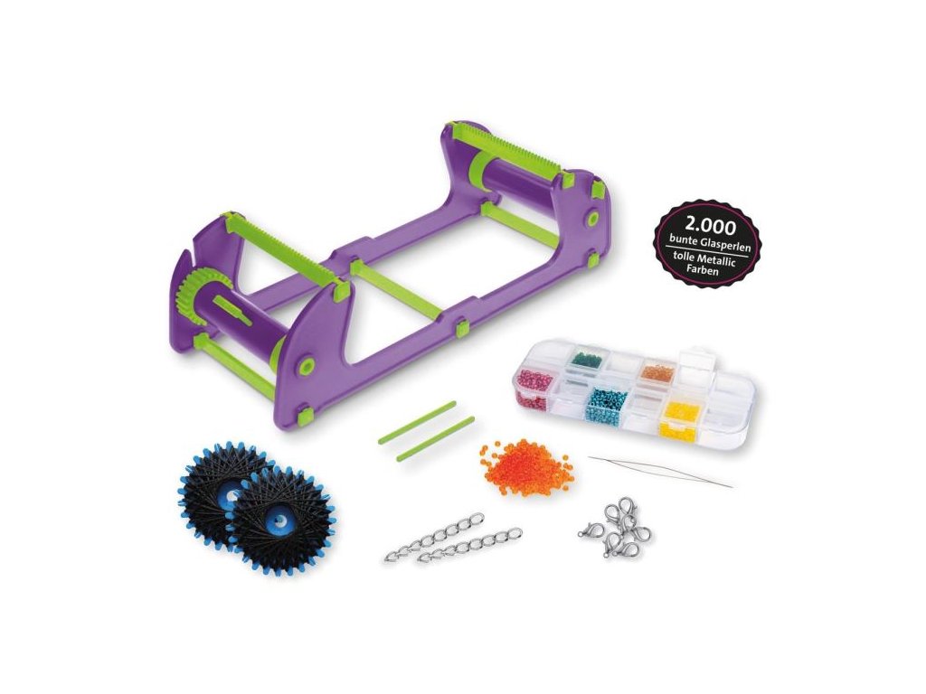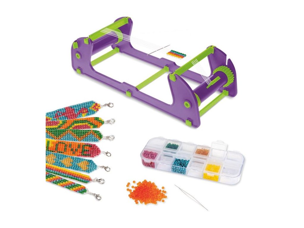 Perličková sada na výrobu cool náramků ze skleněných korálků. Obsahuje rám na tkaní z korálků, přízi, jehlu s velkým očkem, kvalitní korálky v 6 různých barvách a zapínání.Doplňkové parametry